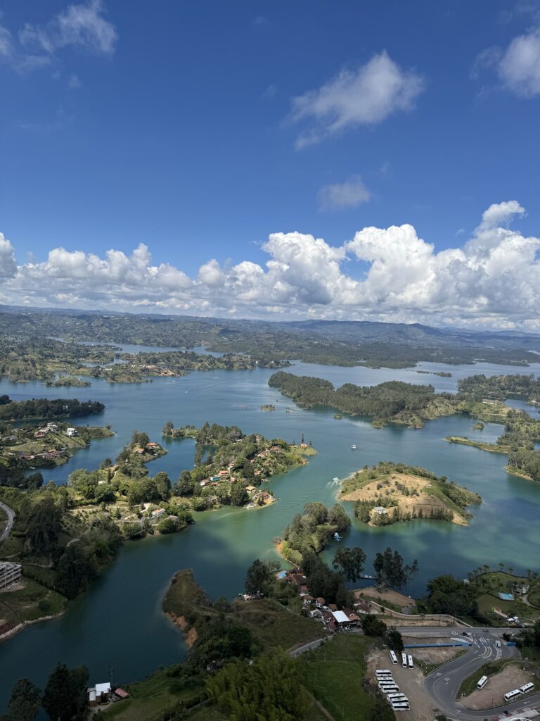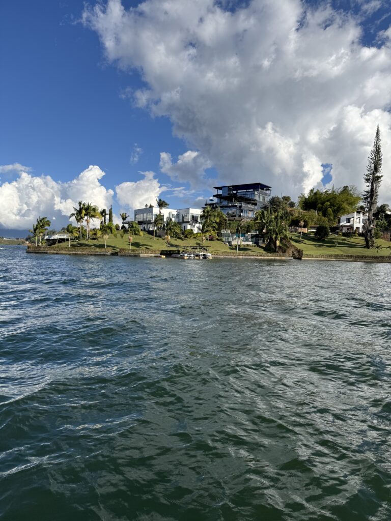 Ripartiamo in pullman e arriviamo a un lago artificiale, creato per la diga che ha sommerso la vecchia Guatapé. La vecchia città era stata in parte distrutta e sommersa negli anni ’70 per la costruzione della diga, ma le comunità furono ricollocate e la zona divenne un’attrazione turistica incredibile.