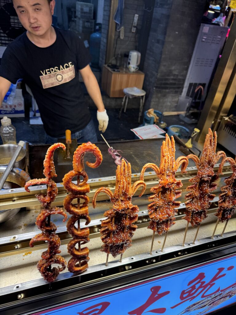 Sempre con loro mi sposto in una zona piena di street food, molto diversa da quello che avevo visto a Pechino. Qui infatti si sente proprio l’influenza della Via della Seta: profumi diversi, spezie, cose che ricordano vagamente il Medio Oriente e l’Asia Centrale.