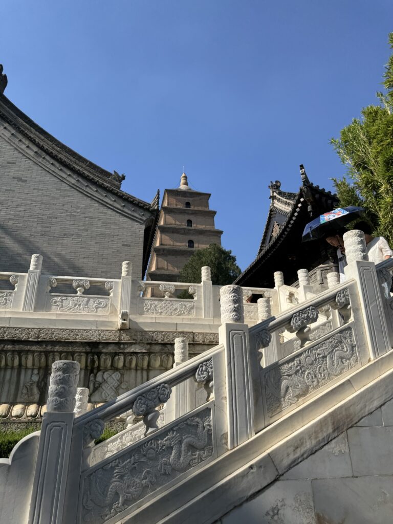 Dopo le mura prendo un tuktuk e dico alla signora che voglio andare alla Pagoda della Grande Oca. Il viaggio è stato… come dire… un’esperienza 😅. Lei simpaticissima, ma sicuramente non proprio Fernando Alonso…